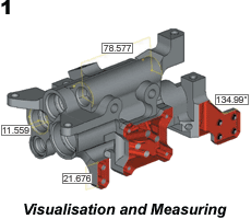 Extensive measuring capabilities can be used as an alternative to traditional paper drawings. Magics enables you to perform 2D and 3D measurements of distances, radii and angles based on planes, cylinders, axis, spheres etc (picture 1).