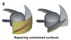 Repairing untrimmed surfaces becomes an easy task when using Magics. Just mark the triangles that need to be trimmed and Magics will cut them along at the intersection line (picture 6).